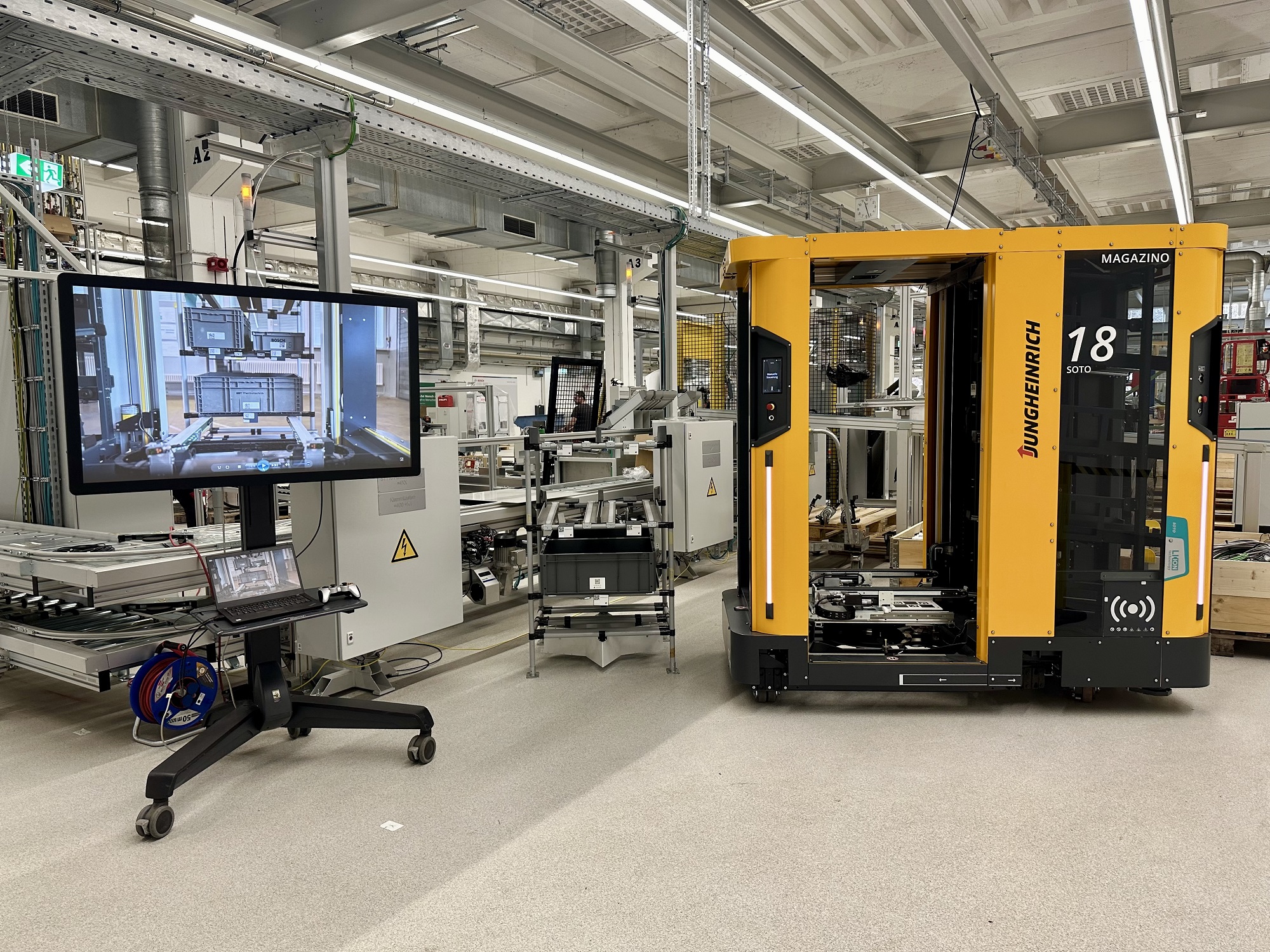 Maskinen bevæger sig helt automatisk gennem lagerlokalet. Med sin fleksible navigation, understøttet af 3D-kameraer og fire laserscannere, kan robotten selvstændigt reagere på eventuelle forhindringer i lagermiljøet og tilpasse sin rute dynamisk. I 2025 vil også grænsefladen mellem det eksisterende kompaktlager til beholdere og produktionslinjens forsyning være fuldautomatisk og styres af SOTO-robotterne. Også fjernelse af små lastbærere fra kompaktlageret til omladningsstedet skal i fremtiden varetages af en robotarm.