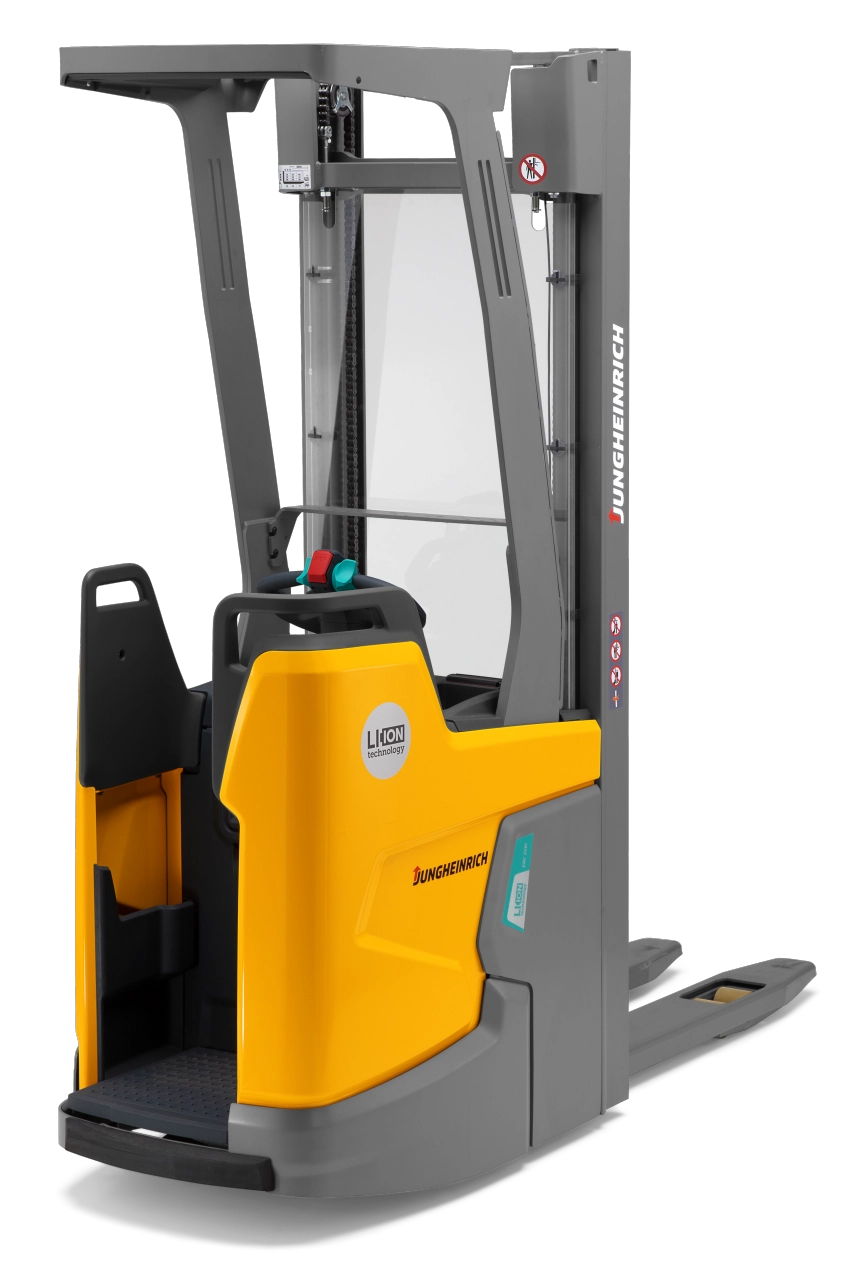 The powerful ERC i electric stacker truck is equipped with lithium-ion technology as standard – for a revolutionary, extremely compact truck design. This manoeuvrable truck is versatile and designed for safe stacking and retrieval operations at heights of up to 6 m. It can transport goods over medium to long distances and is suitable for order picking. Efficiency is maximised by high travel speeds, rapid acceleration and outstanding residual capacity. Stacking assistance systems allow for simple and safe load handling. Perfect ergonomics are ensured by the stable, cushioned stand-on platform and smartPILOT with automatic centring, which enables one-handed truck control. Thanks to good visibility through the mast and the panoramic window (optional) in the overhead guard, the operator always has a great view during the stacking process. Available with many options and additional equipment.